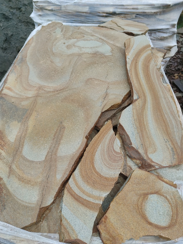 Песчаник жёлтый с разводами - для работ по облицовке цоколя, отмостки, стен, фундаментов, заборов.
